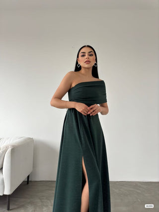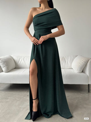 Bekijk allesJurk lang met èèn schouder en split galajurk | Groen